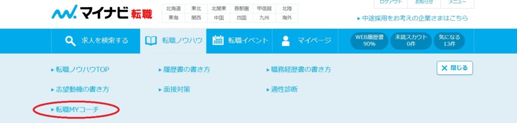 履歴書コーチのサービスは、マイページトップ画面の「転職ノウハウ」をクリックし、プルダウン画面に出てきた「転職MYコーチ」をクリック。