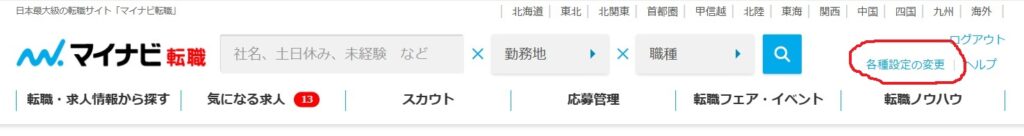 まずは、マイナビ転職マイページのトップ画面から「各種設定の変更」をクリックします。