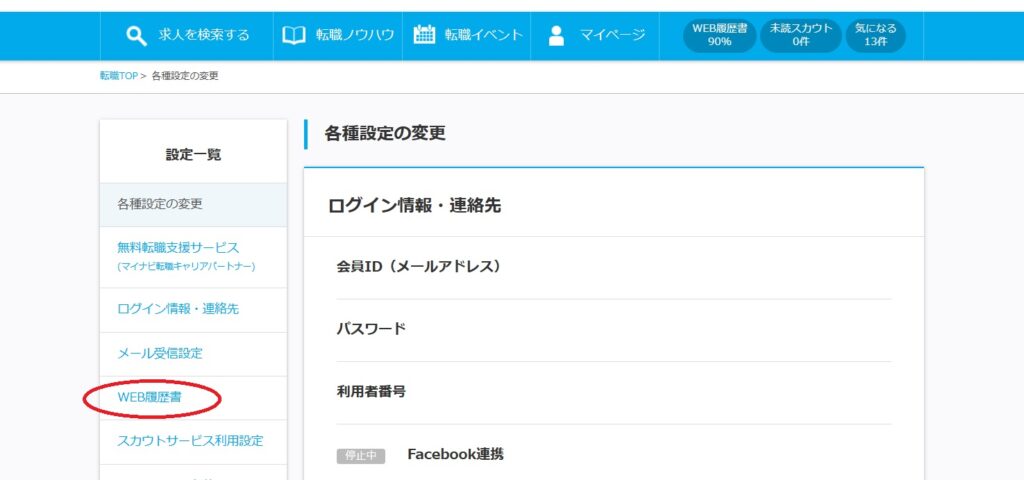 次に、設定一覧にある「WEB履歴書」をクリック。