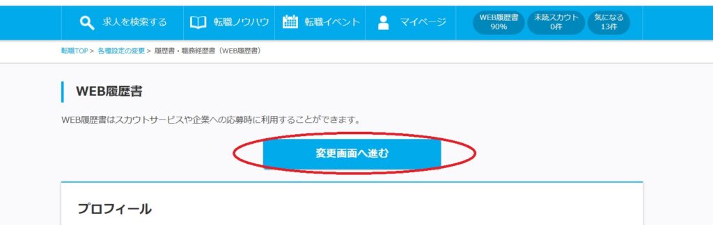 WEB履歴書を開いたら「変更画面へ進む」をクリックすると、プロフィール以降が編集できるようになります。